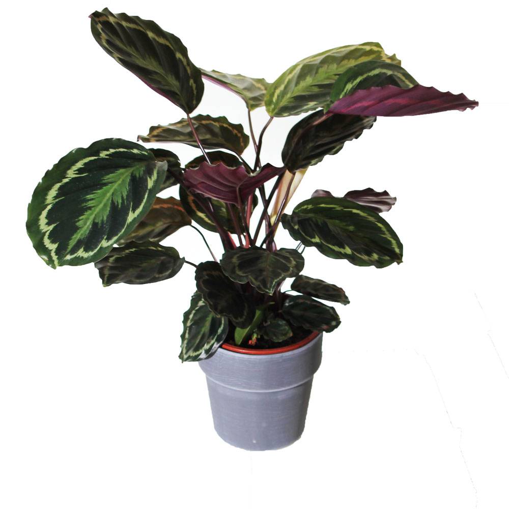 Calathea Medallion (half) shade plant that cleans the air well. She closes her leaves at night, which is why this is also called a 'living plant'.